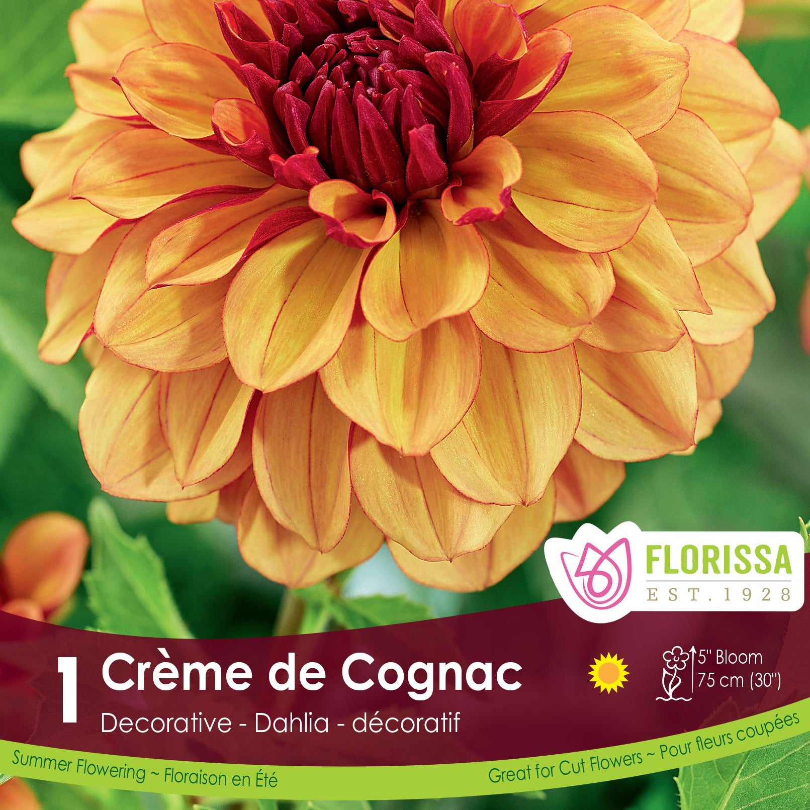 Savour the luxurious beauty of Dahlia 'Creme de Cognac'. Its 5-inch blooms, with light orange petals and rusty red reverse, are a delightful treat for the eyes. Perfect for gardens and vases.