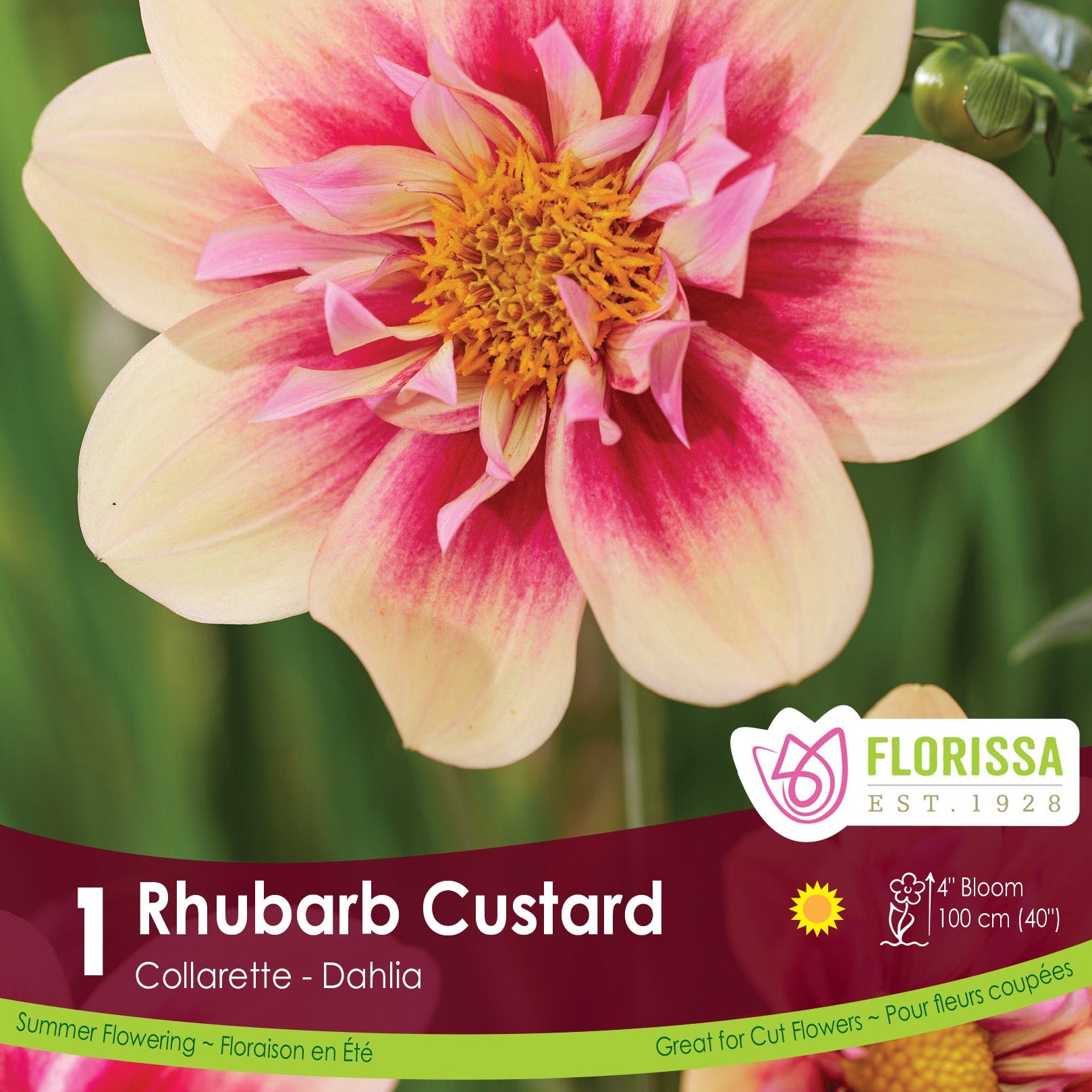 Dahlia ‘Rhubarb Custard’ features 4 inch bicoloured blooms with pale peach petals, a deep pink centre, and a distinctive collar of short, light pink petals. This decorative dahlia adds a playful yet elegant touch to garden beds, borders, and containers. Its long-lasting flowers make it ideal for cut arrangements, bringing charm and vibrant color to bouquets.
