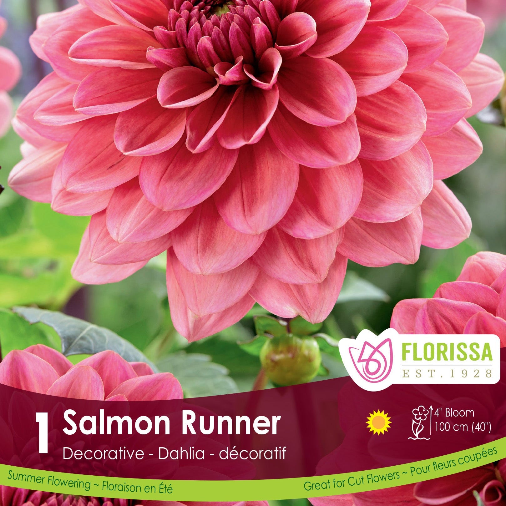 Dahlia 'Salmon Runner' enchants with its abundant coral-salmon blooms, each measuring 4 to 5 inches. With prolific flowering on long, sturdy stems, this beauty is not only a stunning addition to your garden but also makes for an excellent cut flower.
