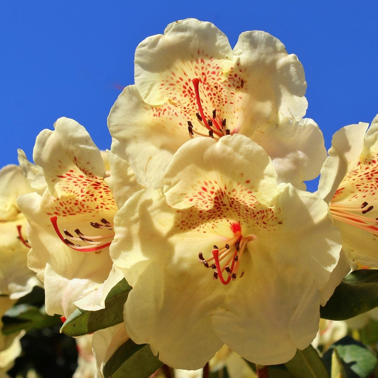 Expect large trusses of golden-orange blooms which emerge mid-May over glossy evergreen foliage. This beautiful cultivar has ‘Hotei’ in its lineage.