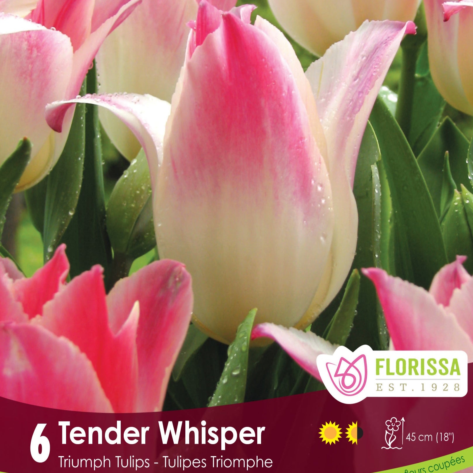 Delicate and elegant, ‘Tender Whisper’ features soft pink and white, lily-like petals that bring a gentle charm to any spring garden. This Triumph Tulip has strong, sturdy stems, making it perfect for cut flowers. Ideal for containers and landscape planting, it adds a subtle and graceful touch to your outdoor space.