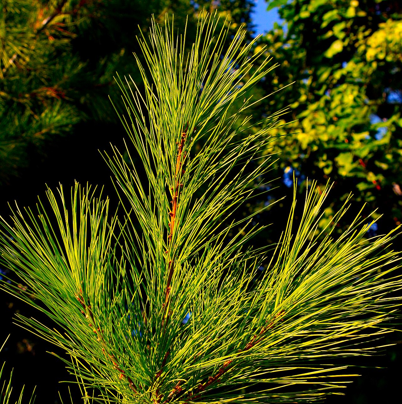 A glowing Eastern White Pine with thin bright gold needles that stand out against the backdrop of the green inner foliage.
